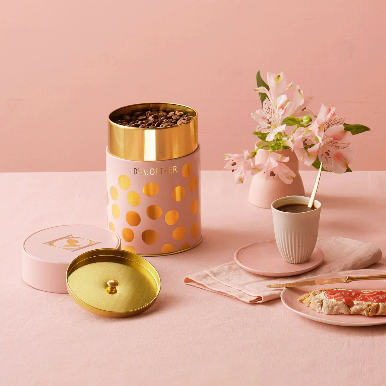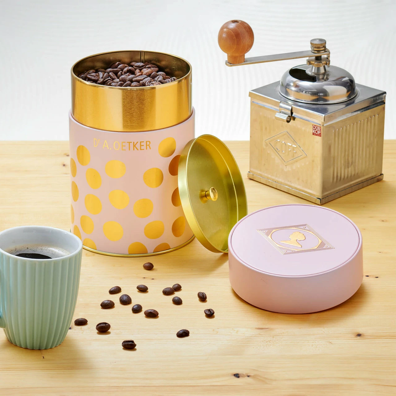 Diese Aromadose „puder-gold“, mit ihrem modernen Design in einem matten Puderton mit goldfarbenen Punkten, ist perfekt geeignet, um den Kaffee, Tee oder andere Lebensmittel optimal zu lagern. Durch den farblich passenden Innendeckel, ist der Inhalt aromageschützt und bleibt damit lange frisch. Erstmalig wurde das eckige Dr. Oetker Logo aufgegriffen, das mit seiner Prägung und den goldfarbenen Details auf der Dose für ein optisches Highlight in der Küche sorgt. Die Dose kann 500g Kaffeebohnen oder 600g Kaffeepulver stylisch und trendy aufbewahren.