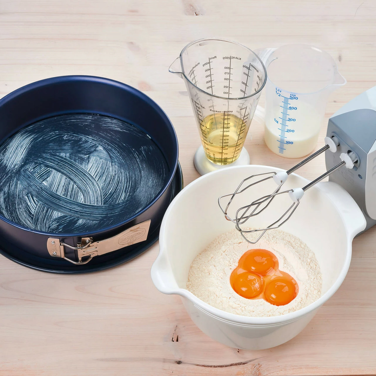 Die Zubereitung ist kinderleicht und macht bereits beim Backen Freude. Einfach die Kuchenbackmischung mit Milch, Eiern und Öl vermengen, die Farbmischungen rosa und grün zu je einem Teigviertel zugeben und die bunten Teige abwechselnd in die Springform füllen. Nach dem Backen kann der Kuchen noch mit einer Glasur überzogen und nach Belieben mit bunter Kuchendeko verziert werden.