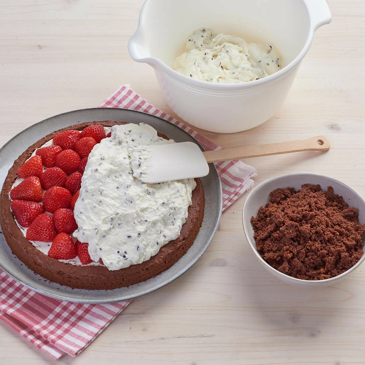 Die Backmischung enthält bis auf frische Zutaten alles, um den fruchtigen Kuchen im Handumdrehen zu backen.Der saftige Maulwurf-Kuchen hat eine lockere Sahnecreme-Schokoladenflocken-Erdbeer-Füllung und wird mit dunklen Rührkuchenbröseln verziert.