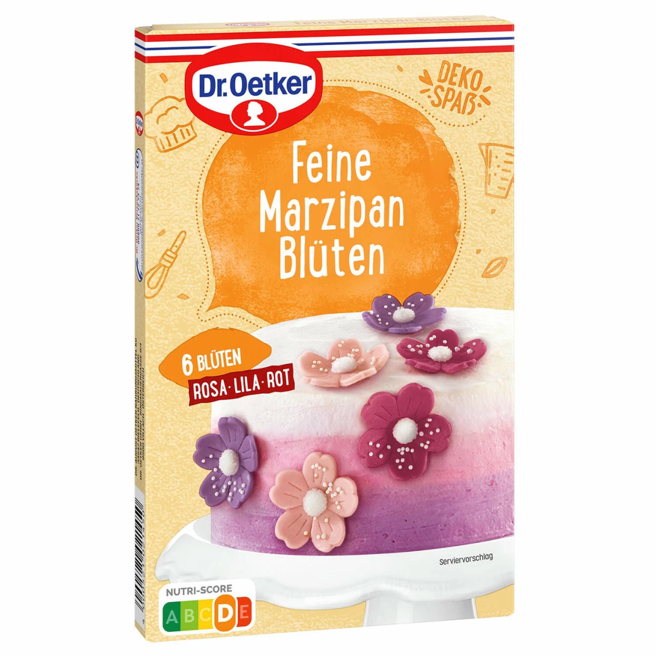 Mit den Dr. Oetker Feine Marzipan Blüten können Sie Ihre Gebäcke in hübsche Blumen-Kreationen verwandeln. Die sechs feinen Blüten in den Farben Rosa, Lila und Bordeaux-Rot sorgen durch ihre besondere Form und Größe nicht nur für einen Blickfang, sondern schmecken auch angenehm nach Marzipan – ein Dekor-Produkt mit Genuss-Faktor!