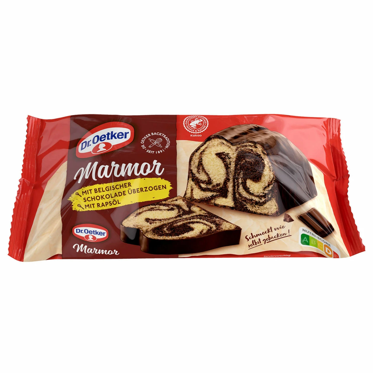 Der marmorierte Kuchen mit lockerer und saftiger Konsistenz schmeckt wie selbstgebacken. Dank der typischen Rührkuchen-Form sieht er auch so aus. Die köstliche vollflächige Glasur aus belgischer dunkler Schokolade verleiht dem Kuchen den letzten Schliff.