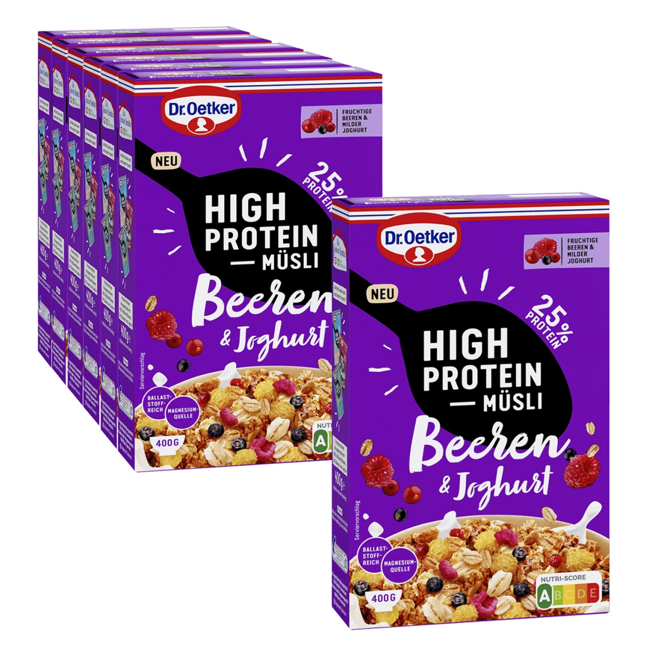 Ob als genussvoller Start in den Tag oder kleiner Snack zwischendurch: das High Protein Müsli Beeren & Joghurt ist die köstliche Kombination aus wertvollen Flocken, fruchtigen Himbeeren, Johannisbeeren und Cranberries sowie mildem Joghurt.