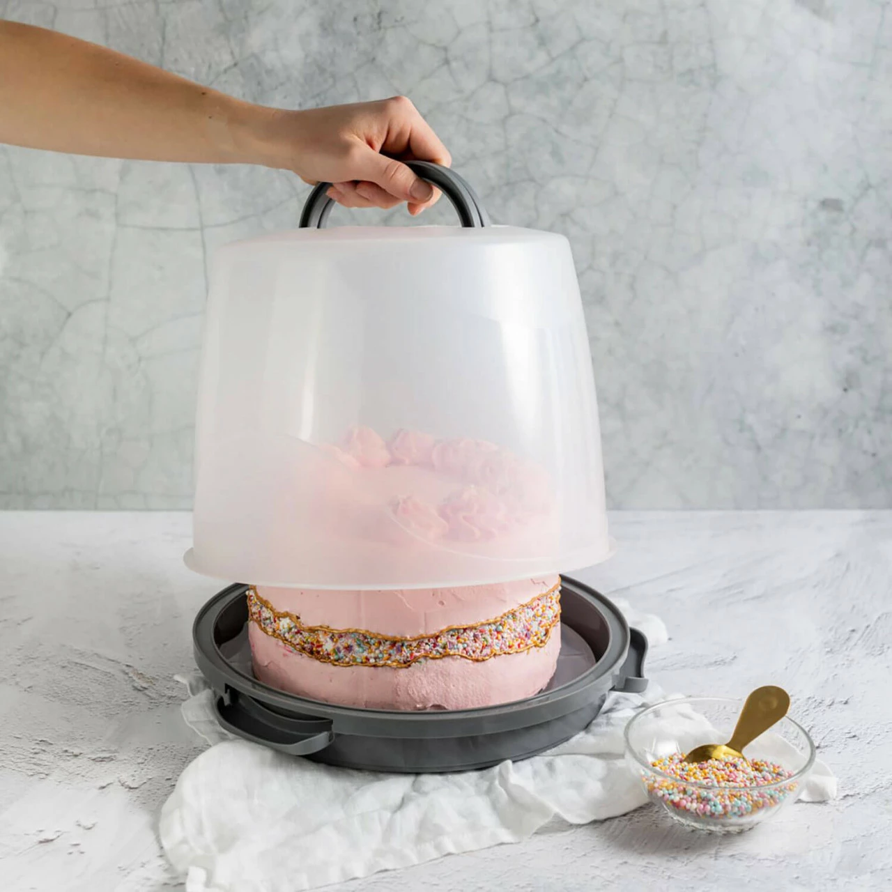 Hohe Torten sehen nicht nur toll aus, sondern schmecken auch gleich doppelt gut. Egal ob Buttercreme oder außergewöhnlicher Drip-Cake, die Backkreationen sollen begeistern und unbeschadet transportiert werden können. Möglich wird das mit der extra hohen (26 cm) und sicheren Transportbox. Dank der cleveren Konstruktion der Box, kann der Kuchen direkt auf dem herausnehmbaren Einlegeboden angeschnitten und serviert werden. Durch den transparenten Deckel lässt sich der Inhalt dauerhaft überprüfen.