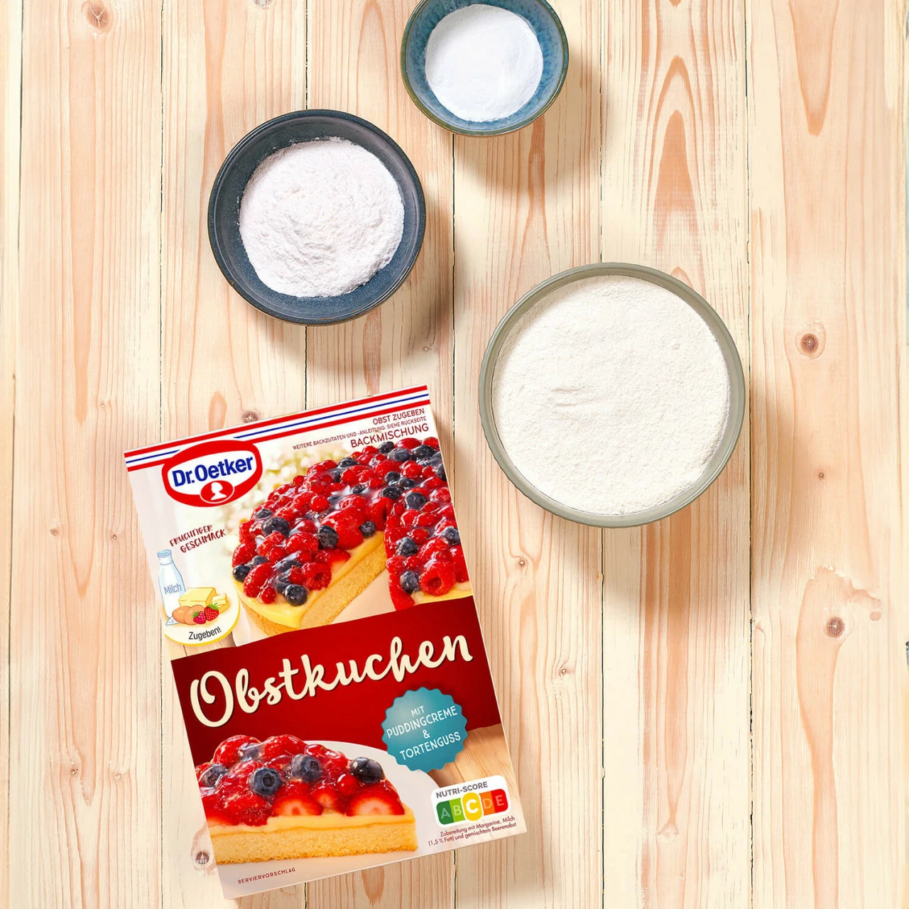 Die Zubereitung ist denkbar einfach: Die Backmischung für den Obstboden nach Packungsanleitung zubereiten und backen. Das beigefügte Puddingcremepulver zubereiten und die Puddingcreme auf dem Obstboden verteilen, Lieblingsobst darauf platzieren und mit dem zubereiteten Tortenguss überziehen. Egal, ob frisches, konserviertes oder gefrorenes Obst – mit unserem fruchtigen Obstkuchen ist jeder Bissen ein Genuss.