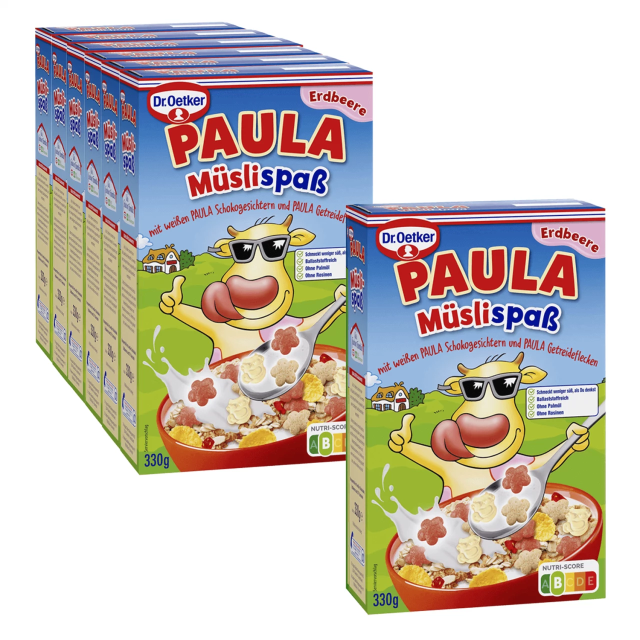 Der Dr. Oetker PAULA Müslispaß gibt es nun auch in der beliebten Geschmacksrichtung Erdbeere und überzeugt die ganze Familie mit kuhlen PAULA-Schokogesichtern aus weißer Schokolade, leckeren Erdbeerstückchen & hellen sowie rosa-roten Getreideflecken. In Kombination mit unserem leckeren Knuspermüsli als Basis bietet es ein spaßiges Knuspererlebnis und schmeckt dabei weniger süß, als man denkt und ist außerdem besonders ballaststoffreich. PAULA Müslispaß – ein echtes Highlight auf dem Frühstückstisch!