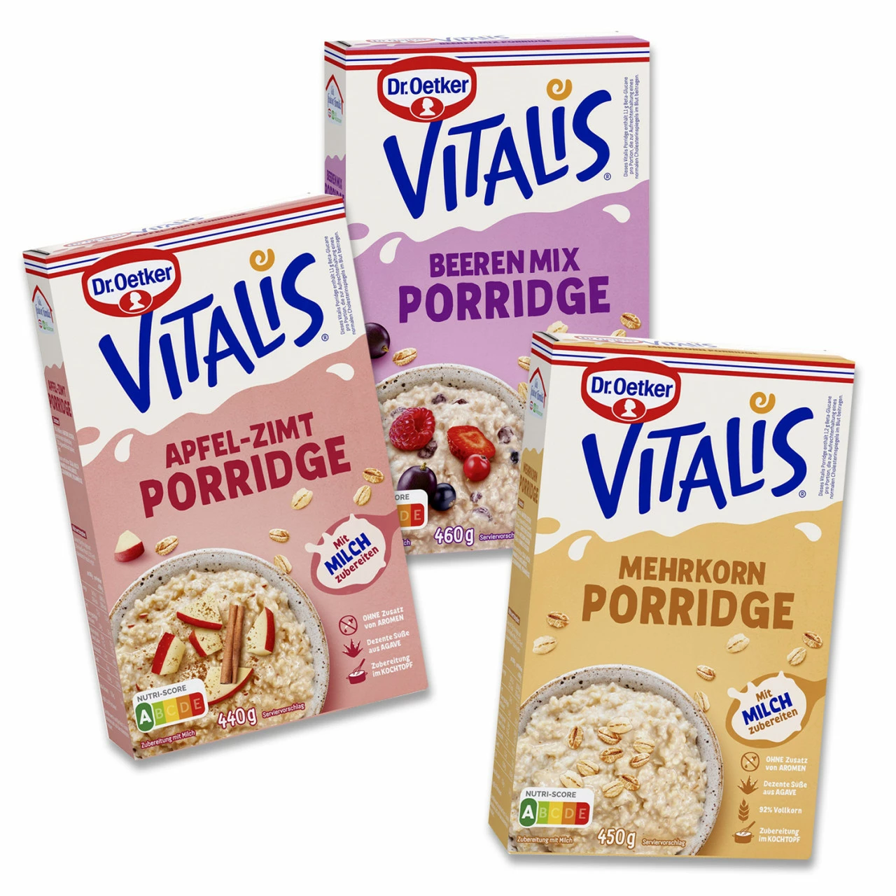 Das Dr. Oetker Vitalis Porridge in der großen Familienpackung überzeugt durch individuelle Portionsgrößen und ist köstlich zum selber Verfeinern. Die Zubereitung im Kochtopf mit Milch bietet außerdem eine vegane Alternative und sorgt für noch mehr Flexibilität auf dem Frühstückstisch. Und wer jede Sorte probieren möchte, liegt mit diesem Set genau richtig. Das Probier-Set enthält alle drei Sorten mit 15 % Preisvorteil gegenüber dem Einzelkauf.