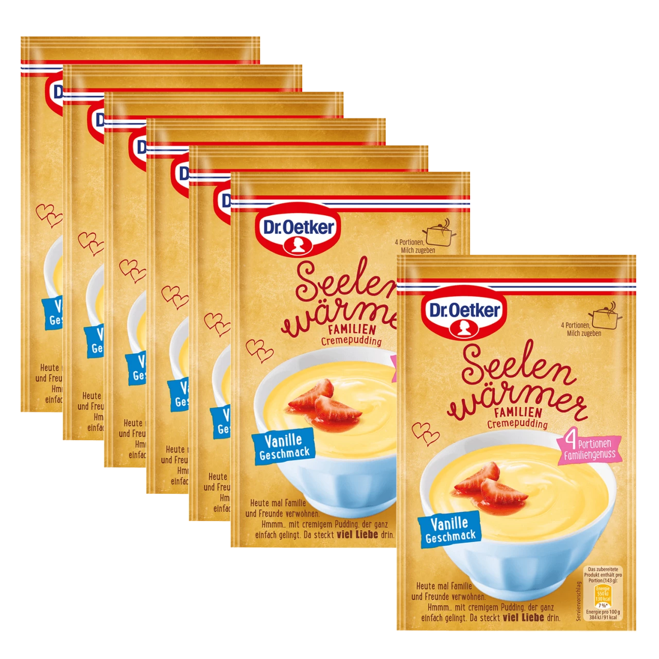 Die Seelenwärmer Familien-Cremepuddinge schenken durch reichhaltige Rezepturen einen vollmundigen Geschmack mit ausgeprägter Cremigkeit. Die Zubereitung mit warmer Milch vermittelt echte Verwöhnmomente und das gute Gefühl von Glück und Geborgenheit. Nur in 500ml kochende Milch einrühren – brennt garantiert nicht an. Für 4 Portionen in der beliebten Sorte Vanille-Geschmack.