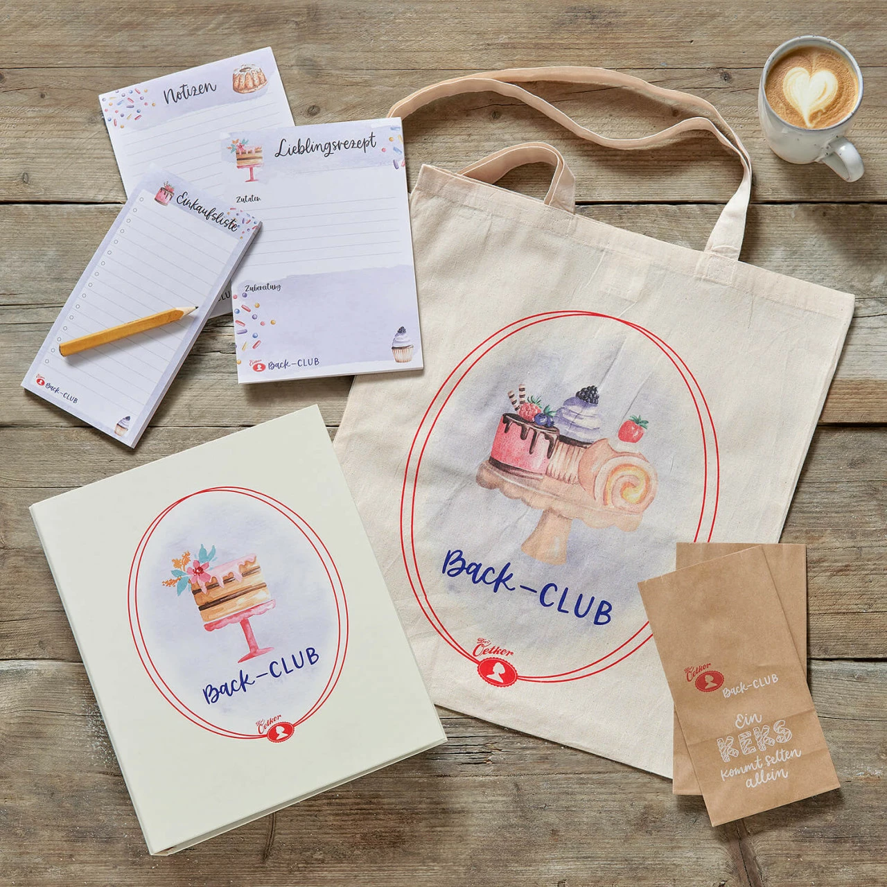 Das Set, bestehend aus verschiedenen Back-Club-Artikeln, lässt keine Wünsche offen. Die hübschen Illustrationen wurden eigens von Hand für den Back-Club gezeichnet und spiegeln sich in allen Artikeln wider. Mit der Jutetasche „Aquarell“ können Sie auch unterwegs zeigen, dass Sie ein Back-Club Mitglied sind. Das 3er-Block-Set erleichtert den Alltag und mit den zwei Kekstüten lassen sich Ihre selbstgebackenen Köstlichkeiten schön verpacken. Der Back-Club Ordner „Aquarell“ rundet das Set ab und wurde mit einer speziellen Bindung extra kreiert, um Ihre Gugelhupf-Magazine aufzuheben. Dank der praktischen Heftleiste müssen die Gugelhupf nämlich nicht mehr gelocht werden. Das Set eignet sich auch wunderbar, um es zusätzlich zu einer Back-Club Mitgliedschaft zu verschenken. Vielleicht die nächste Geschenkidee?