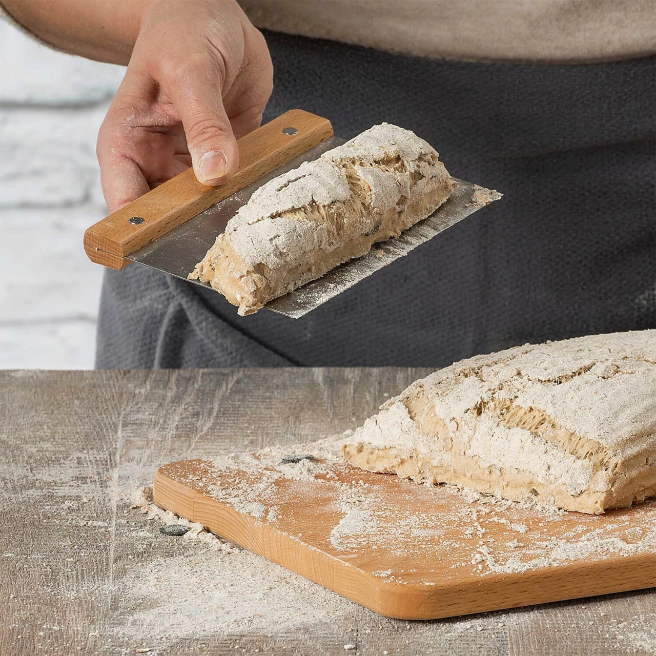 Der Teigabstecher mit Holzgriff (15 x 12 cm) ist ideal zum Portionieren und Aufteilen von Brotteig. Das Funktionsteil besteht aus hochwertigem, robustem Edelstahl und der Griff aus Buchenholz. Für besonders genaues Aufteilen des Teiges hat der Abstecher eine integrierte Linealfunktion.