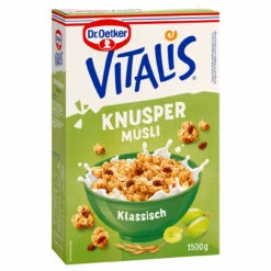 Sorgfältig ausgesuchte, sonnengereifte Rosinen und schonend geröstete Weizenkeime machen Vitalis Knuspermüsli klassisch so unverwechselbar köstlich und unüberhörbar knusprig. Mit der original Vitalis-Knusperqualität schmeckt es einfach unglaublich lecker– jedes Knusperstückchen ist ein einziger Knuspergenuss. Das spezielle Röstverfahren sorgt dafür, dass Vitalis Knuspermüsli klassisch richtig knusprig bleibt.Dr.Oetker Vitalis Knuspermüsli klassisch liegt im Verbrauchertrend und sorgt mit ausgesuchten Rohstoffen und raffinierter Rezeptur für einen genußvollen Start in den Tag. Du erhälst dieses Produkt in den Packungsgrößen 600 g und 1,5 kg.Vitalis– Genuss, der gut tut!