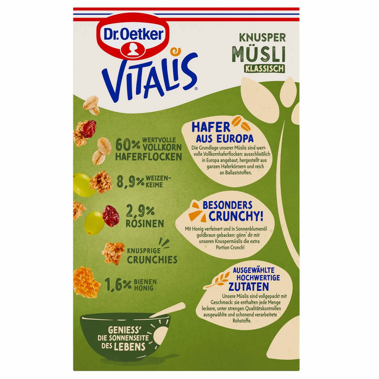 Sorgfältig ausgesuchte, sonnengereifte Rosinen und schonend geröstete Weizenkeime machen Vitalis Knuspermüsli klassisch so unverwechselbar köstlich und unüberhörbar knusprig. Mit der original Vitalis-Knusperqualität schmeckt es einfach unglaublich lecker– jedes Knusperstückchen ist ein einziger Knuspergenuss. Das spezielle Röstverfahren sorgt dafür, dass Vitalis Knuspermüsli klassisch richtig knusprig bleibt.Dr.Oetker Vitalis Knuspermüsli klassisch liegt im Verbrauchertrend und sorgt mit ausgesuchten Rohstoffen und raffinierter Rezeptur für einen genußvollen Start in den Tag. Du erhälst dieses Produkt in den Packungsgrößen 600 g und 1,5 kg.Vitalis– Genuss, der gut tut!