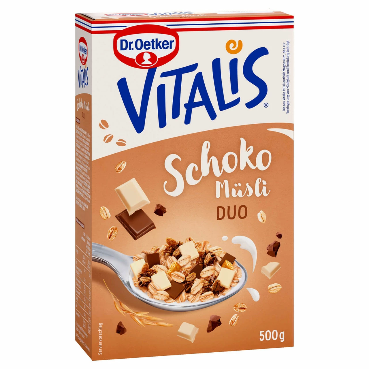 Vitalis SchokoDuo Müsli bietet gleich doppelten Schokoladen-Genuss. Zartschmelzende Vollmilch- und leckere weiße Schokolade sind in diesem Müsli einzigartig kombiniert.Die feinen Schokoblättchen zerschmelzen zart auf der Zunge. Kernige Vollkorngetreideflocken und herrlich karamellisierte Mandeln geben dem Müsli Biss. Für einen besonders schokoladigen Start in den Tag.Vitalis – Genuss, der gut tut!