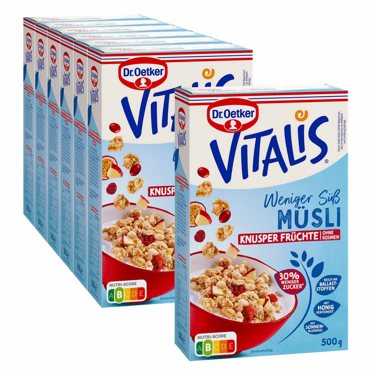 Vitalis Weniger süß gibt es auch in den leckeren Geschmacksvarianten Schoko Müsli, Knusper Pur und Knusper Himbeere.