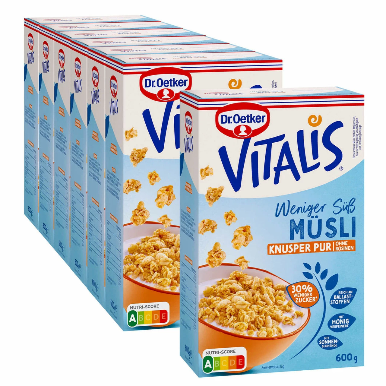 Vitalis Weniger süß gibt es auch in den leckeren Geschmacksvarianten Schoko Müsli, Knusper Früchte und Knusper Himbeere.
