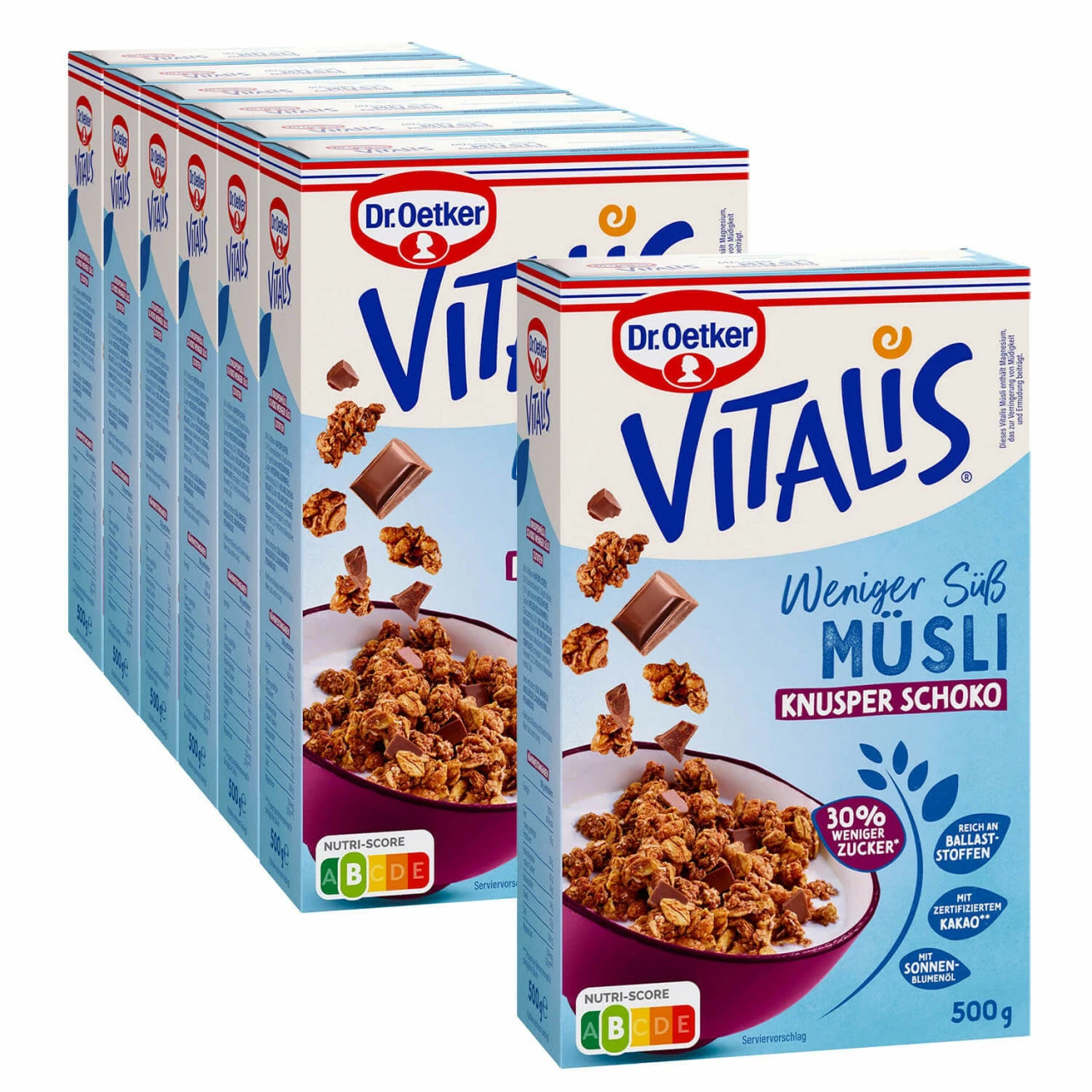 Vitalis Weniger süß Knusper Schoko enthält 30% weniger Zucker als andere Knusper Schokomüslis. Mit knusprigen Crunchies und Vollmilch-Schokolade.